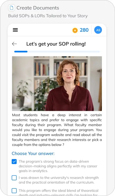 Craft standout application documents with our expert-guided SOP and LOR creation tools. Present your story in a compelling way that sets you apart in global admissions.